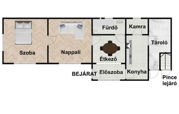 -85nm-es( konyha, fürdőszoba, nappali,lakószoba, előszoba,kamra és egy tároló) 6nm-es terasz, 15nm-es garázs, 4nm-es pince és 20nm-es tároló mellett több kisebb tárolót is találunk