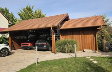 - új két állásos autóbeálló, térkövezett járdák + tároló.