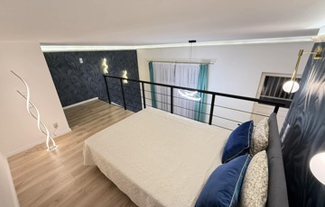 A szoba végéből kényelmes lépcső vezet fel a légies megjelenésű galéria szintre, ahol a franciaágyon kívül méretes gardróbszekrény is helyet kapott.