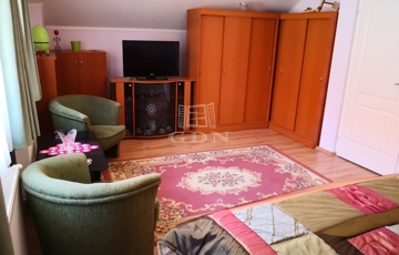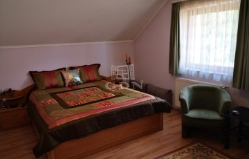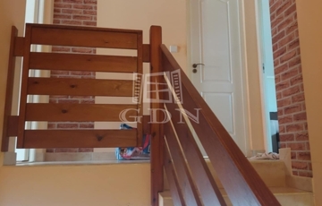 A ház alsó szintjén tágas, teraszkapcsolatos nappali-konyha-étkező, kádas fürdőszoba és egy spejz, az emeleten színtén egy fürdőszoba és kettő szoba található erkéllyel.