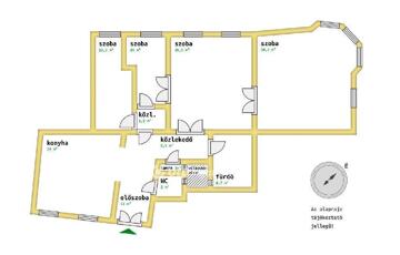 A lakásban egy 20 nm-es étkezős konyha, három nagy méretű szoba (28,6 és 34,2 nm-es főhelyiségekkel), egy további kisebb szoba, külön fürdő, WC és kamra található.