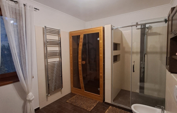 a tágas nappali-étkező egy légtérben, modern, gépesített konyha, vendégwc, szülői hálószoba, melyhez tartozik egy saját gardrób és egy nagyméretű fürdőszoba, melyben a kabin mellett egy kétszemélyes infraszauna ( Wellis) is helyett kapott.