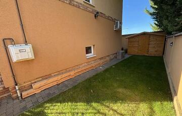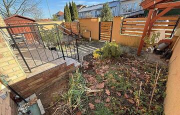 A 206 m²-es kert, öntözőrendszerrel ellátott, valamint egy 6 m²-es tároló is rendelkezésre áll. A házhoz két saját gépkocsibeálló tartozik: egyik a ház udvarán, a másik az elektromos kapu előtti területen található.