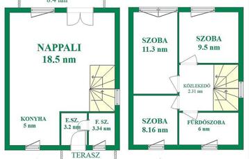 Az emeleten egy kényelmes méretű fürdőszoba és három praktikus elrendezésű szoba kapott helyet.