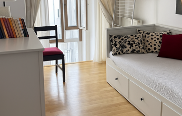 Felső szint 40 m, ahol 2 külön nyíló hálószoba található, plusz egy fürdőszoba, csendes, belső udvarra néző ablakokkal