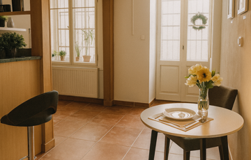 A lakás egyik különlegessége az eredeti fa nyílászárók és stukkók, melyeket iparművészek restauráltak, visszaadva a polgári építészet időtálló szépségét.