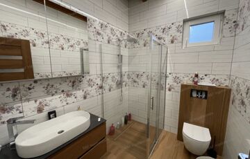 Valamint egy 70 m2-es családi ház 2 szobával, fürdővel és wc-vel, nagy amerikai konyhás nappalival.