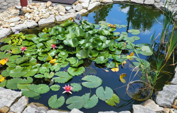 • fóliasátor, medencének kialakított terület és kis kerti tó