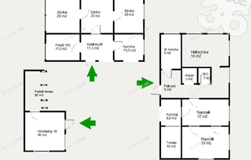Két ház, 135 m2 és 90 m2, egy hűtött- fűtött közösségi tér 60 m2, fedett terasszal ami szintén 60 m2.