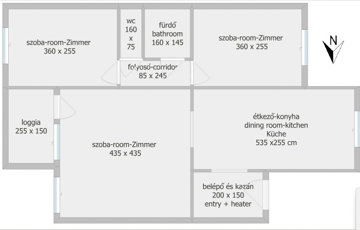 Mérete 60 nm, a szobákon felül étkezős konyha is van a lakásban.