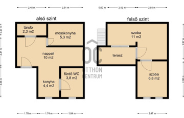 - A jó állapotú 44 m2-es ház felső szintjén két és fél szoba kapott helyet.