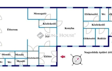 A nagyobbik felépítmény kb. 140m2-es, a házban korábban étterem üzemelt. Belső terei jelenleg ennek megfelelően vannak kialakítva, családi házzá, vagy két különnyíló lakássá is átalakítható. Az ingatlan belső állapotát tekintve felújításra szorul, statikailag megfelelő állapotban van. Külső homlokzata rendezett, teteje szép állapotú, modern, gázbeton cseréptető.