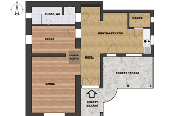 Szobákban laminált parketta, többi helyiségben járólap a padlóburkolat.