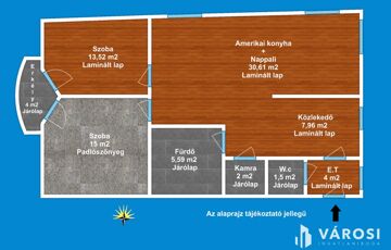A lakás 1 db amerikai konyhás nappalival, 2 db hálószobával, 1 db fürdőszobával, külön Wc-vel, kamrával, közlekedővel, erkéllyel rendelkezik. Az ingatlan elhelyezkedésre, kialakítása miatt, maximálisan kiemeli ezt az ingatlant az átlagos társasházi lakások sorából és egyedülálló választássá teszi azt. További előny, hogy az eladó 2018 - ban kicserélte a nappaliban és a szobákban, valamint az előtérben és közlekedőben a burkolatokat. És az ingatlan legutolsó esztétikai felújítása 2022-ben volt.