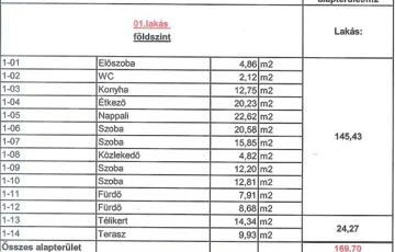 1. lakás: földszinten található nettó: 145,43nm-es (bruttó 169,7nm) amerikai konyhás nappali+ 4 hálószobás lakás. Az ingatlanhoz tartozik egy 14,34nm-es télikert, egy 9,93nm-es terasz és egy saját használatú kert ami 167,65nm.