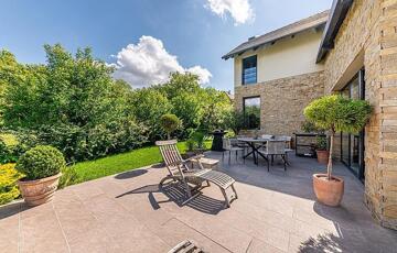 Budakalász kedvelt részén, csupán 15 perces sétára a HÉV megállótól helyezkedik el, így könnyen megközelíthető a város iskolái, óvodái, illetve üzletei egyaránt. A kilátás panorámás, továbbá a nyeles teleknek köszönhetően az intim szférából sincsen hiány. A ház és a kert gyönyörűen karbantartott, többek közt öntözőrendszer is kiépítésre került.