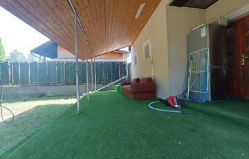 Az udvaron található egy 17 nm-es garázs szerelő aknával, valamint egy 20 nm-es fedett kocsibeálló is. A kert gondosan ápolt, örökzöldekkel és termő gyümölcsfákkal, ami igazán barátságossá teszi a környezetet.