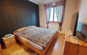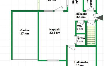 Az első ház 90 nm, 2007-ben épült, 38-as Leier téglából, belső kétszintes kialakítással. A földszinten nappali, konyha, hálószoba, kamra és egy hangulatos terasz található. A tetőtér jelenleg nincs teljesen befejezve, azonban minden gépészeti előkészítés megvan (fűtés, víz) a nyílászárók be vannak építve – így könnyedén kialakítható benne további két hálószoba és egy fürdőszoba.