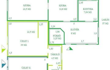 Téglaépítésű, 1 szintes, 2 utcai bejárattal rendelkező üzlethelyiség 15+30 m2-es. Tartozik hozzá egy 57 m2, felújítandó lakás, ahol konyha, 1+1 félszoba, fürdő és előtér került kialakításra. Egy 20 m2 tároló is rendelkezésre áll.