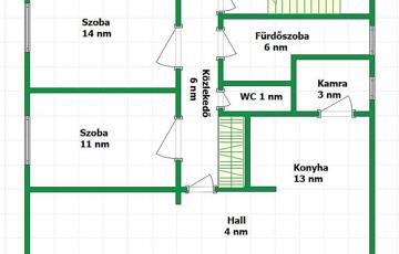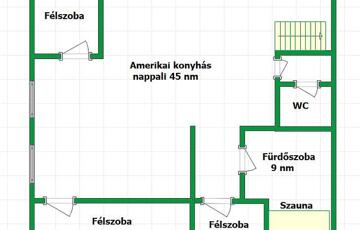 A földszinten található egy nappali, két hálószoba, konyha, kamra, étkező, előszoba, hall, közlekedő, fürdőszoba, külön WC, valamint egy lépcsőház és egy fedett terasz is továbbá a tetőtérben van egy amerikai konyhás világos nappali, három félszoba, egy szaunával felszerelt fürdőszoba és egy WC.
