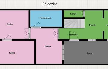 A földszinten 3 szoba, fürdőszoba, konyha, tágas étkező és kamra található.