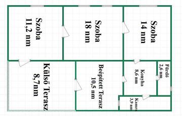 Elosztását tekintve 3 szobával, konyhával, fürdőszobával, spájzzal, terasszal rendelkezik.