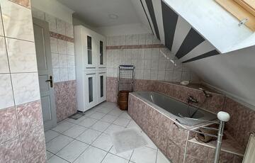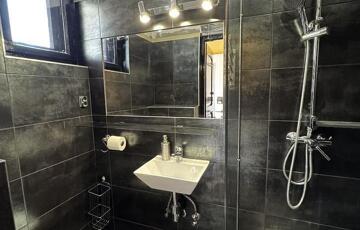 A földszinti fürdőszoba teljes egészében 2024-ben lett felújítva, újra burkolva, és a szaniterek cserélve.