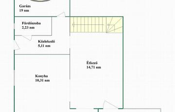 Az alsó szinten 50 nm-es amerikai konyhás nappali plusz étkező, ezen kívül tároló, zuhanyozós fürdőszoba, nagy belmagassággal rendelkező, jól pakolható garázs, és 15 nm fedett terasz.