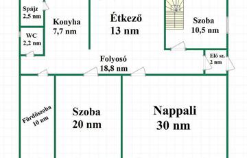 Elosztását tekintve a földszinten: nappali, konyha, 3 hálószoba, előszoba, fürdőszoba+WC, külön WC található. Az emeleten konyha, 2 hálószoba, fürdőszoba került kialakításra.
