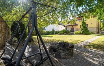 A kert és az udvar külön figyelmet érdemel: 2015-ben teljesen megújult, dísznövényekkel, amerikai tulipánfával, japán birssel, sziklakerttel és automata öntözőrendszerrel felszerelve. A hátsó udvar csendes, intim részében grillező és tűzrakóhely került kialakításra, beton térkő sétánnyal – a baráti összejövetelek kedvenc helyszíne lehet. A gyep alá vakondháló került, így mindig rendezett, zöld környezet várja az új tulajdonosokat.