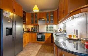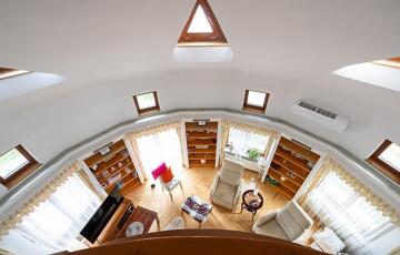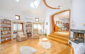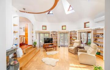 A 1998-ban épült, masszív, 38 cm-es Porotherm téglából készült épületet az eredeti építtető és tervező gondos odafigyeléssel tájolta, a belső tereket pedig funkcionálisan és esztétikusan alakította ki. A ház egyik különleges eleme a szinteltolásos, körcikk alakú nappali, amely galériás kialakításával, kandallójával és nagy belmagasságával lenyűgöző központi teret biztosít – ez a ház valódi szíve.