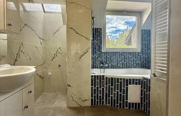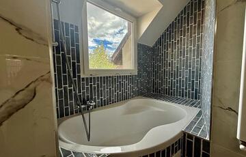 A felújítás során a szobák új laminált parkettát, a vizeshelyiségek pedig nagy, minőségi járólapos burkolatot kaptak. A fürdőszobában pedig beépítésre került új kád, illetve egy építtetett zuhanyzó. Az összes belső nyílászáró is cserére került. Beszerelésre került egy új kondenzációs kazán is kémény béleléssel, illetve a villanyhálózat cseréje is megtörtént és jelentős bővítés is.