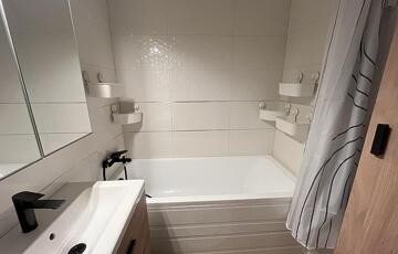 A fürdőszobában akrilkád került beépítésre, a mosógép számára a kiállás kialakításra került. A konyhába új bútorok, valamint mosogatógép kerültek be.