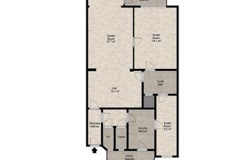 Ezen felül kialakításra került egy 9,5 nm-es hátsó kertre néző hálószoba, egy erkélykapcsolatos, 8 nm-es konyha, valamint külön wc, kamra, közlekedő és előszoba.