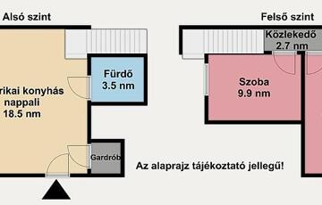 Az ingatlan nettó 47 nm, bruttó 58 nm alapterületű, praktikus elosztású: az alsó szinten amerikai konyhás nappali, a felső szinten pedig két külön nyíló hálószoba található. A házközponti fűtés egyedi méréssel működik, a klíma pedig a nyári hónapokban biztosítja a kellemes hőmérsékletet.