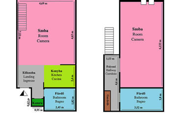 Az alsó szinten tágas, utcai nézetű, amerikai konyhás jellegű nappali található délkeleti tájolással, valamint egy kamra és egy fürdőszoba. A felső szinten előtér, gardróbhelyiség, hálószoba és egy másik fürdőszoba kapott helyet.