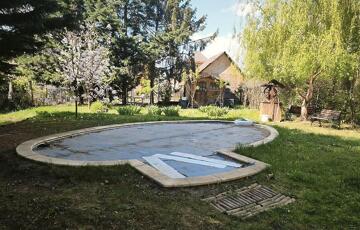 A telken található egy fa melléképület és egy medence.