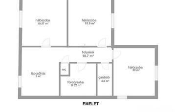 Magasföldszint: tágas, amerikai konyhás nappali (innen nyílik a nagy terasz), fürdőszoba és külön mellékhelyiség, közlekedő és lépcsőház.