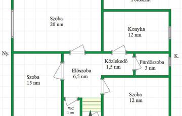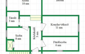 A földszinti lakrész 70 nm, 3 db szoba, konyha, fürdőszoba, előszoba és tároló található.