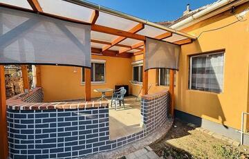 A házrészhez tartozik egy 20 nm-es nagy fedett terasz valamit egy szerelő aknával ellátott garázs.
