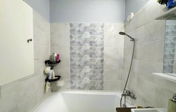 A fürdőszoba új burkolatot kapott és új akrilkáddal rendelkezik. A mosógép ebben a helyiségben kapott ki- és beállást, a WC egy külön helyiségben található.