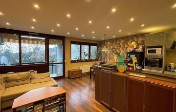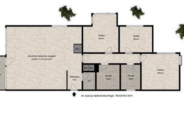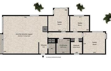 A lakás központi része a tágas, nagy üvegfelülettel rendelkező, dk-i fekvésű, erkélykapcsolatos, szép kilátással rendelkező amerikai konyhás nappali.