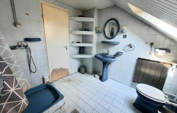 A 2 generációs családi házból leválasztott egység felújítandó. A földszinten egy nappali, étkezős konyha, kamra, fürdőszoba, külön mosdó található és a lépcsőfeljáró alatti kis dolgozószoba található. A tetőtérben 3 hálót és egy fürdőt alakítottak ki. Saját villanyórával rendelkezik. A fűtést a saját pincében elhelyezett vegyestüzelésű kazán és egy gázkazán is biztosíthatja, a melegvízről bojler gondoskodik, a nappaliban 3 éve klíma került felhelyezésre. Elektromos tolókapu nyílik az udvarra, ahol autóbeállási lehetőség biztosított, de garázs is található az udvarban