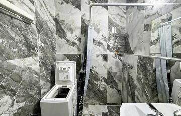 A fürdőszoba új burkolatot kapott és zuhanyzóval rendelkezik. A mosógép ebben a helyiségben kapott ki- és beállást, a WC egy külön helyiségben található.