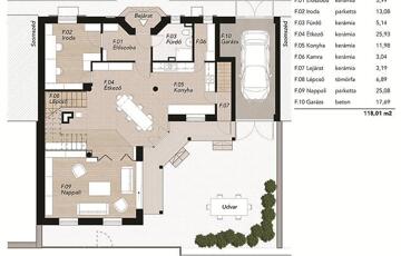 A kertbe a házon kereszt, vagy a garázson keresztül tudunk hátra jutni, a garázs mind két oldalán garázs kapu van, így autóval áthaladásra is biztosított.