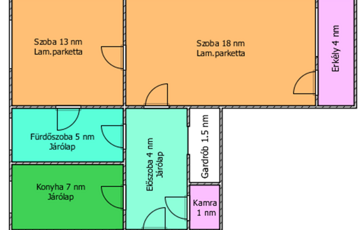 Helyiségei: 2 szoba, konyha, kamra, fürdőszoba, előszoba, erkély.