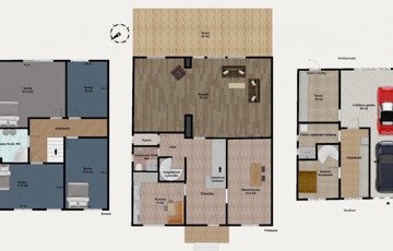 A pinceszinten nagy tároló, két állásos garázs, szauna és háztartási helyiség található, valamint a kertbe közvetlen kijárás is megoldott. A földszinten konyha, étkező/szoba, hatalmas nappali és 21 m2-es, kertkapcsolatos terasz, zuhanyzós fürdő-WC, valamint kamra, az emeleten további 4 hálószoba és egy sarokkádas fürdőszoba található.