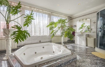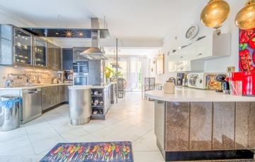 A négy szint teljes bruttó alapterülete 480 m2: a pinceszinten garázs és lakrész található, a földszinten nappali magában 58, mellette a konyha-étkező 31, a jakuzzikádas fürdőszoba pedig 14 m2.