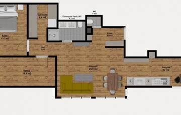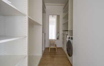 A két hálószoba mellett egy minden igényt kielégítő gardrób is kialakításra került, ide lett kivezetve a mosógép kiállása.