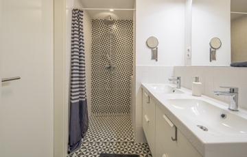 A fürdőszoba zuhanyzós, duplacsappal szerelt, valamint a külön WC mellett itt is található WC.